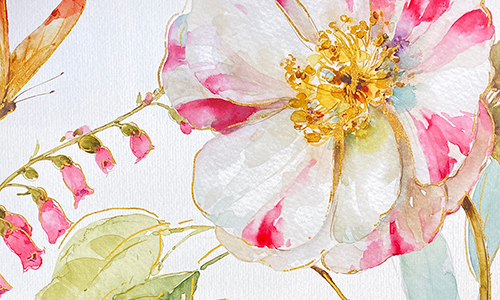 季節の花々が生きいきと描かれた背景は、ファッション雑誌のワンカットのような洒落た仕上がりに。